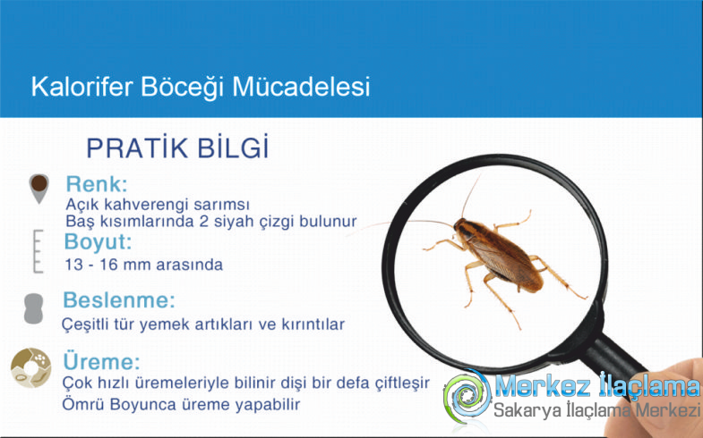 Kalorifer böceği yada bir diğer ifadeyle halk arasındaki adı hamam böcekleri sıcak ortamlarda barınmayı seven, her yerde yaşamaya elverişli böceklerdir. Sıcak ortamları seven kalorifer böcekleri özellikle evlerimiz için büyük tehlike oluşturmaktadır.Kalorifer böceği evlerde genellikle mutfak ve banyolara yerleşerek yuva oluşturmaktadır. Pis ortamlarda gezinerek her türlü atık ile beslenen kalorifer böceği gezdiği alanlara mikrop ve bakterilerini bulaştırmaktadır. Kalorifer böceği ilaçlama uygulamaları yaşam alanlarımızı bu zararlı böcek türlerinden kurtaracak önemli uygulamalardır.